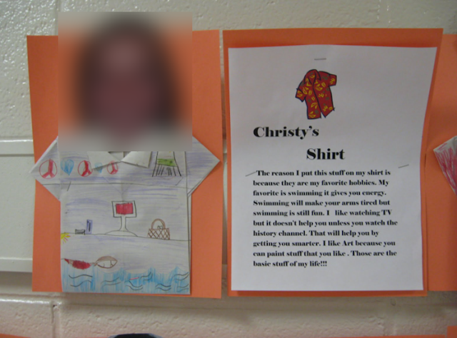 This class made origami t-shirts that they then decorated with items that represented themselves. They wrote about the decorations and how they fit into their lives in the computer lab (using Microsoft Word). The teacher took pictures of their heads and they were cut to fit the t-shirts.