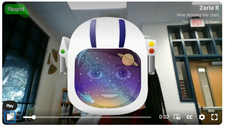 Once Mrs. Waters read the book to students we explored all the tools within Flipgrid to see what could be used to help us with our story retell. The emojis were very popular and we discovered a cool space helmet and career emojis that include multi-colored and gendered astronauts.